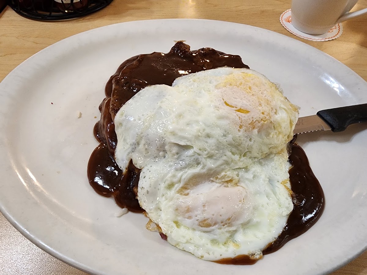 Ground beef over rice and eggs with brown gravy.